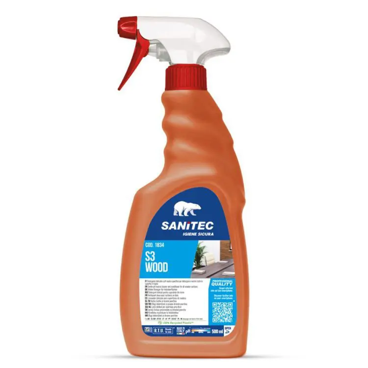 Navodilo za uporabo: Čistilo za les Sanitec S3 Wood napršite na čisto krpo z razdalje približno 20 cm. S krpo nanesite na površino in obrišite do suhega.
