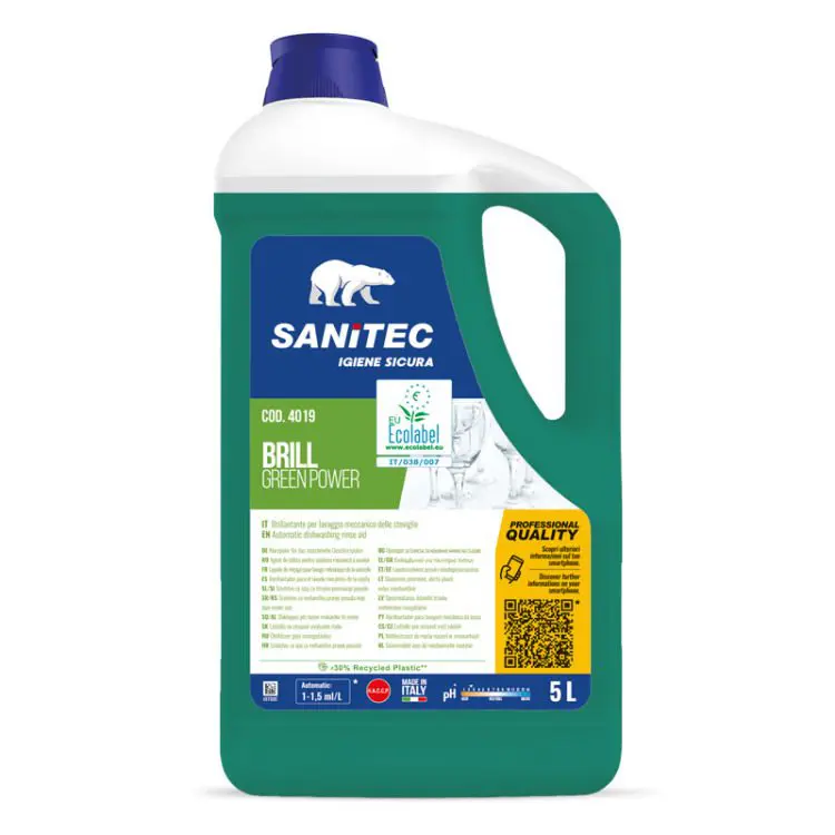 Ekološko izpiralno sredstvo za pomivalni stroj, primerno za uporabo pri kateri koli stopnji trdote vode, vključno z vodo, prečiščeno z obratno osmozo. Formula, ki se ne peni, posodo pusti suho in bleščečo, brez nalaganja vodnega kamna.