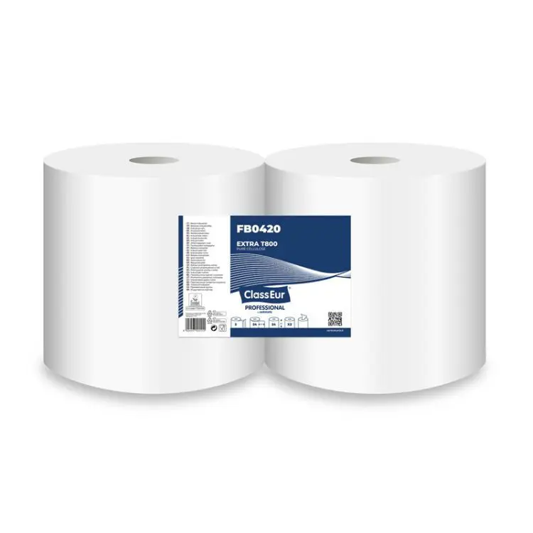 Industrijske papirnate brisače 2-slojne primerne za prostore z veliko frekvenco ljudi. Posamezna papirnata rola vsebuje 460 papirnatih brisač. Industrijske papirnate brisače ClassEur Extra T800 odlikuje posebnost uporabe z zunanjim ali sredinskim izvlekom (Center Pull). Primerne za uporabo z vsemi podajalniki industrijskih brisač.