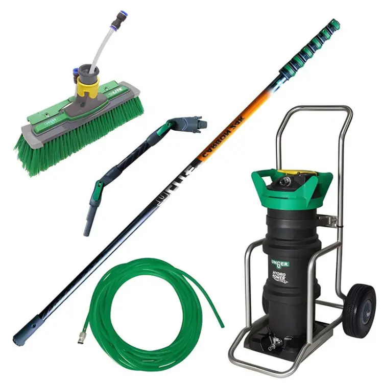 Profesionalni komplet za zunanje čiščenje stekel z deionizirano vodo, ki vključuje filtrirno enoto Unger HydroPower Ultra in lahko 8,6 m karbonsko teleskopsko palico. Omogoča hitro čiščenje oken, steklenih fasad in solarnih panelov brez lis, neposredno s tal.