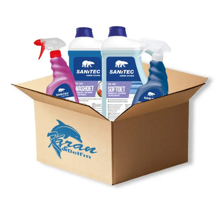 Sanitec komplet čistil za pranje perilo. Komplet vsebje tekoči detergent, mehčalec perila, odstranjevalec madežev na osnovi kisika in odstranjevalec mastnih madežev.