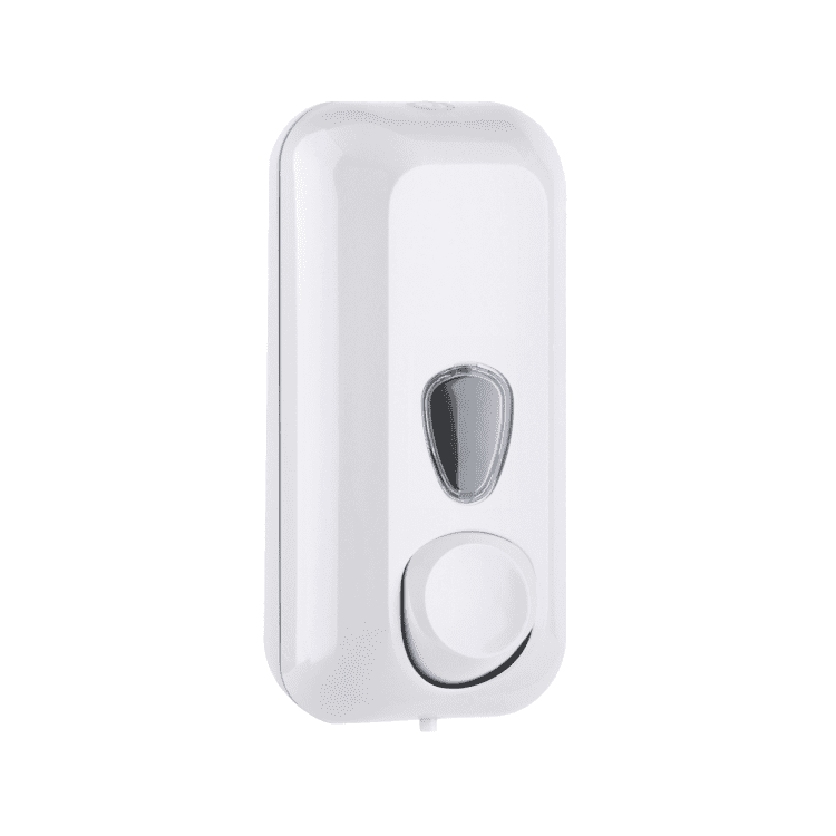 Podajalnik tekočega mila (dotakanje), bele barve. Eleganten izgled, primeren za namestitev v večino javnih toaletnih prostorov. Sodi v skupino Marplast podajalnikov.