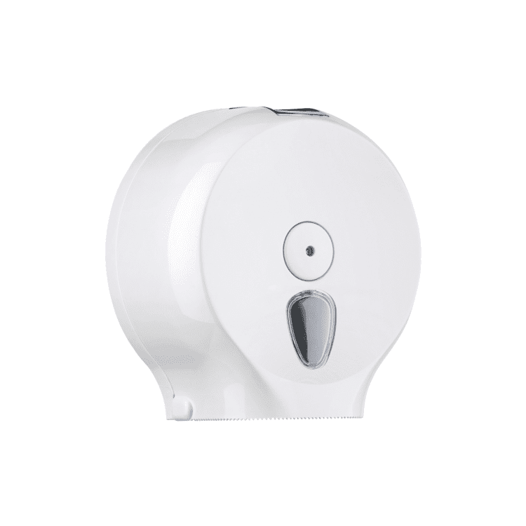 Podajalnik WC papirja v roli mini jumbo. Z oknom za spremljanje porabe. Na voljo v beli barvi. Sodi v skupino Marplast podajalnikov.