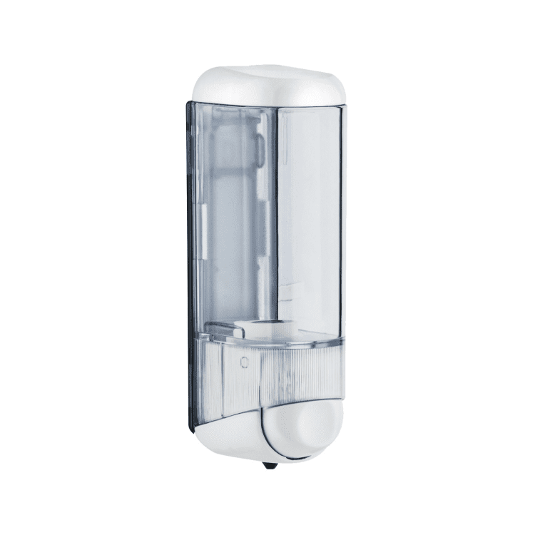 Majhni transparentni milnik za tekoče milo, primeren za manjše sanitarije.
