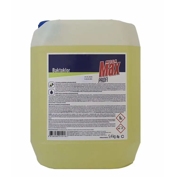 Megamax Profi Baktoklor je tekoče dezinfekcijsko vsredstvo, na osnovi stabiliziranega natrijevega hipoklorita. Deluje učinkovito na širok spekter mikroorganizmov. Posebna kombinacija alkalij daje proizvodu tudi čistilne lastnosti.