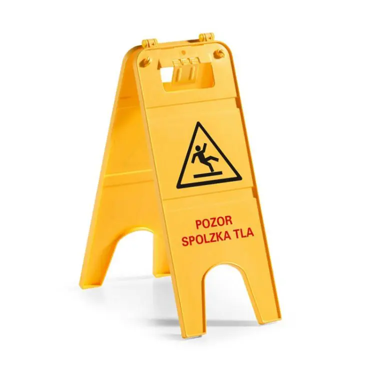 Opozorilna tabla s slovenskim napisom “Pozor spolzka tla”, ki omogoča ustrezno zaščito področja čiščenja, dokler so tla mokra in spolzka (npr. ob razlitjih, večji količini padavin). Postavi se na vidno mesto, kjer opozarja mimoidoče na nevarnost.