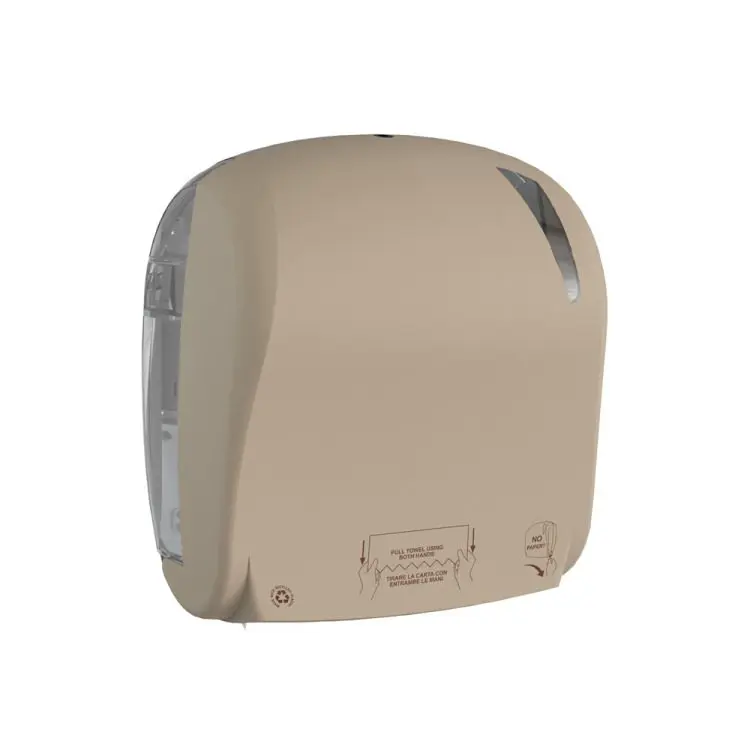 Podajalnik papirnatih brisač v roli z avtomatskim odrezom “Autocut”. Z natisnjenimi indikacijami za uporabo, zagotavlja maksimalno higieno, zaradi česar je ta podajalnik primeren za standarde H.A.C.C.P. Za podajalnike iz linije Sand, ki so izdelani iz reciklirane plastike, je značilna zrnasta peščena tekstura. Podajalniki linije Sand so diskretni in hkrati prepoznavni ter primerni za uporabo v širokem spektru objektov. Podajalniki Mar Plast-ove linije Sand so narejeni iz certficirane reciklirane plastike. Z izbiro Autocut brisač lahko v primerjavi z zloženimi brisačami prihranite tudi do 30%.