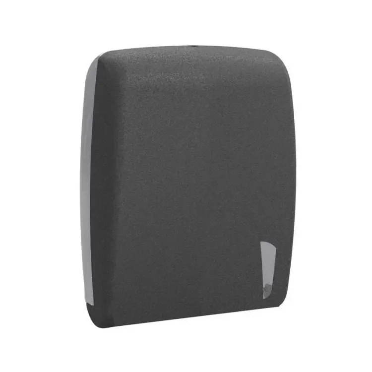 Podajalnik papirnatih brisač “zloženk”. Primeren za “V” in “Z” in “C” zložene brisače. Izgled kamna – značilna zrnata tekstura in antracitna barva. Podajalniki linije Stone so barvani z okolju manj škodljivimi vodnimi barvami in narejeni iz certficirane reciklirane plastike.