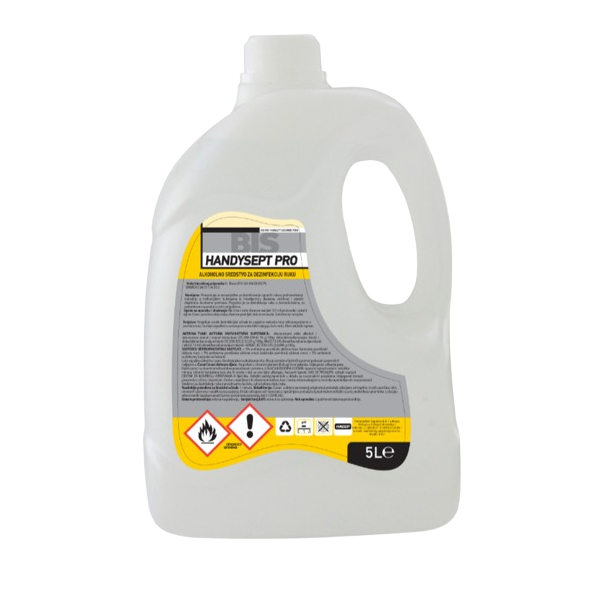 BIS HANDYSEPT PRO je profesionalno alkoholno razkužilo za roke, namenjeno izključno profesionalni uporabi. Izdelek vsebuje 76 % denaturiranega etanola in dodatne aktivne sestavine (didecildimetilamonijev klorid 0,125 % in alkil(C12-16) dimetilbenzilamonijev klorid 0,099 %), ki zagotavljajo širok spekter protimikrobnega delovanja. Visoka vsebnost alkohola in amonijevih spojin omogoča hitro in učinkovito uničevanje bakterij, gliv ter virusov – Dokazano deluje baktericidno, fungicidno in virucidno, kar zagotavlja širokospektralno zaščito pred patogeni.