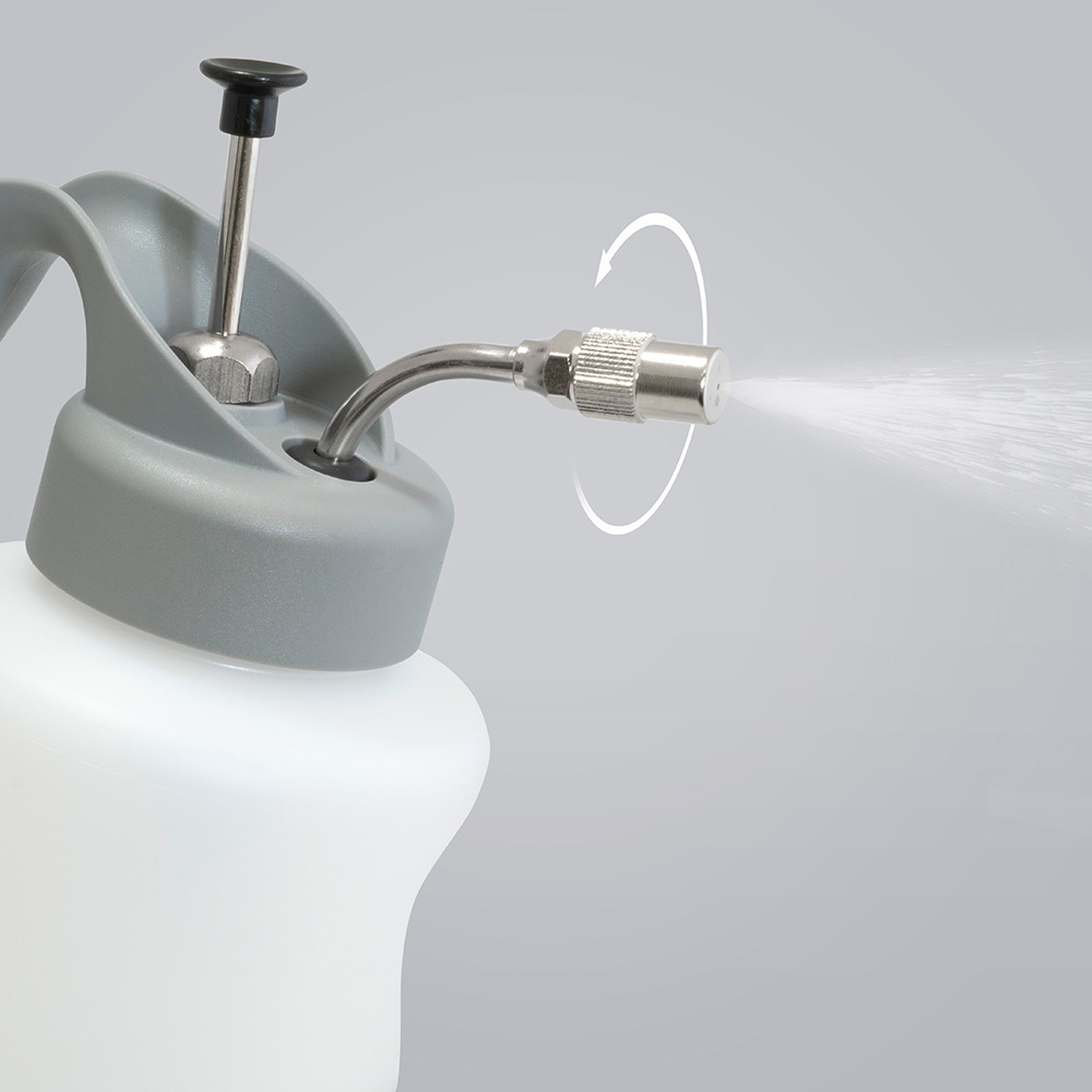 - Odlična stabilnost – veliki premer dna rezervoarja zagotavlja, da razpršilec stabilno stoji na delovni površini in se ne prevrne.