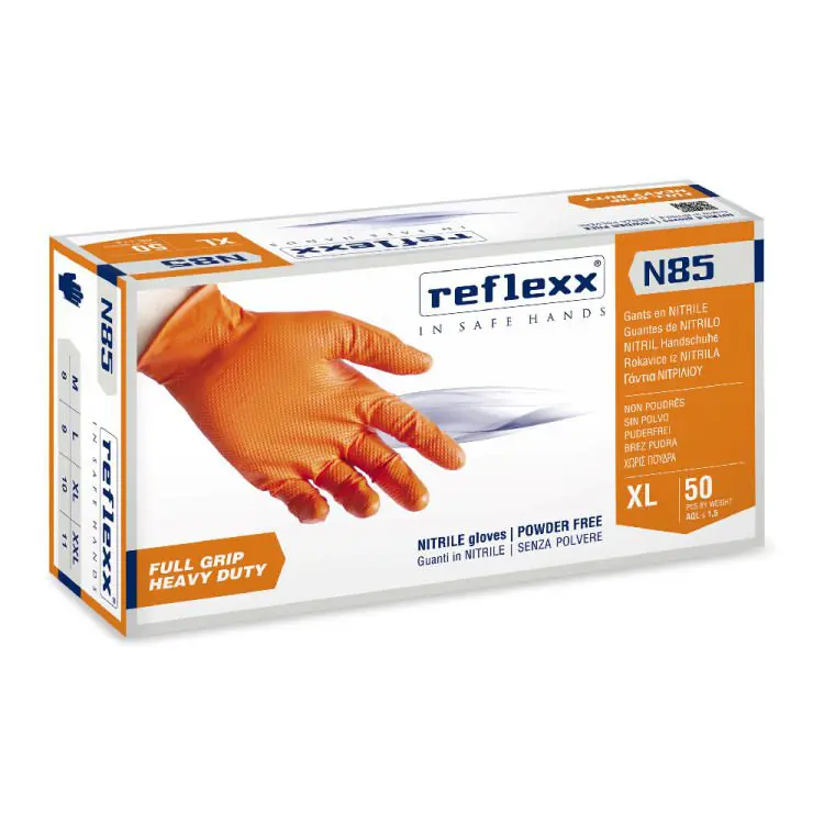 Oranžne nitrilne rokavice z gripom (teksturirane), debelejše. Izjemno močne in vzdržljive. Rokavica je primerna za stik s čistimi kemičnimi izdelki za obdobje, krajše od časa pronicanja, navedenega v tabeli kemijske odpornosti. Posebej primerne za uporabo v strojništvu, industriji in avtomobilski industriji.