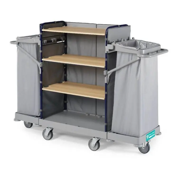 Večnamenski hotelski voziček iz polipropilena in kovine, prilagodljiv za vsako potrebo čiščenja.