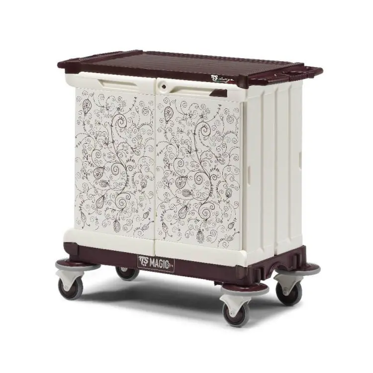 Zaprti hotelski / servirni voziček z grafiko. Večnamenski voziček iz polipropilena z visoko zmogljivostjo za shranjevanje, modularen in prilagodljiv.