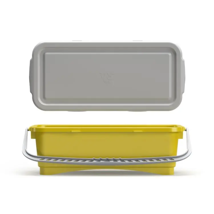 Vedro iz polipropilena z ročajem v rumeni barvi, s pokrovom. Primerno za čiščenje oken in drugih površin. Zaradi svoje posebne oblike gredo lahko vanj pripomočki in krpe do 50 cm. Narejeno iz kakovostnega materiala za dolgo življenjsko dobo izdelka.
