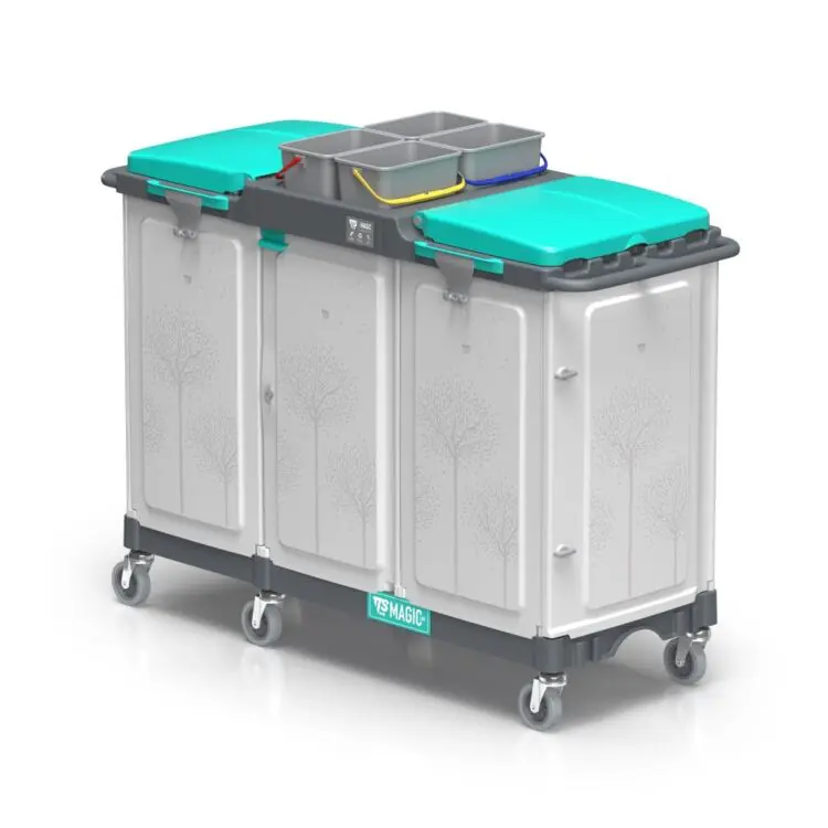 Večnamenski voziček za čiščenje Magic omogoča, da ima uporabnik na voljo celotno paleto opreme, potrebne za strokovno čiščenje. Zaprti voziček s 3 območji: 150 L, prostor za shranjevanje s predalom in 150 L držalom za vrečke. Voziček je iz polipropilena, enostaven za čiščenje, povsem okolju prijazen ter nerjaveč. Vrata imajo možnost zaklepanja.