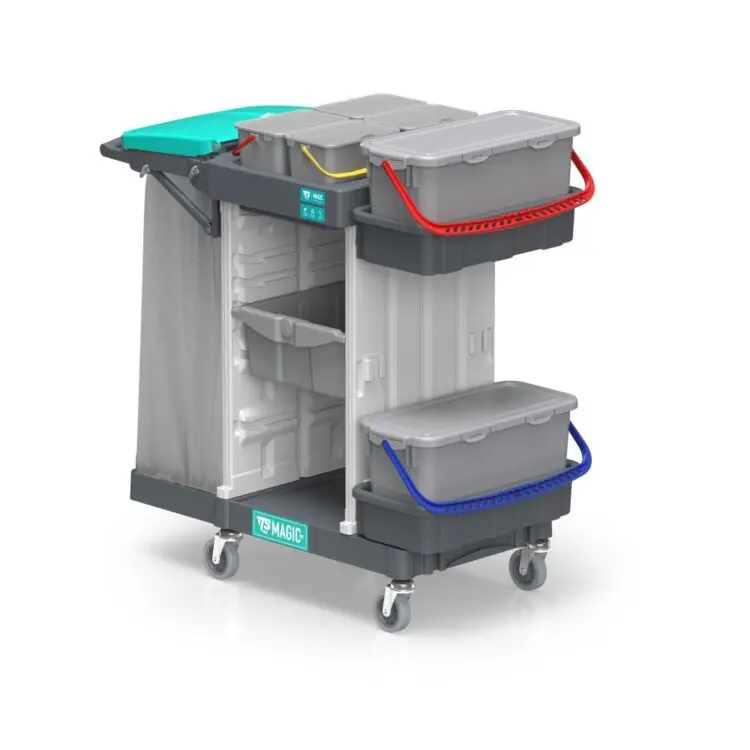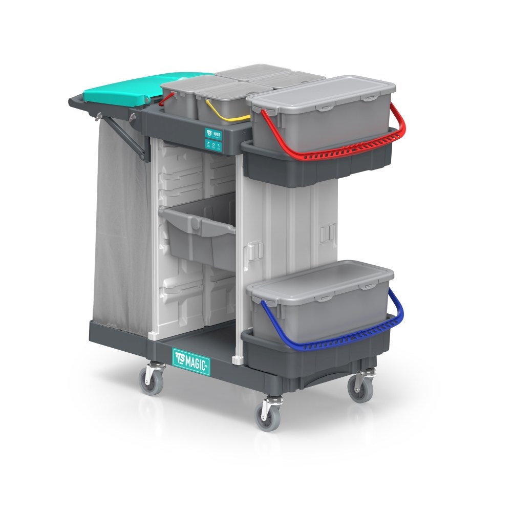 Voziček za čiščenje TTS Magic System 700B je visokokakovosten, modularen večnamenski voziček za profesionalno čiščenje. Omogoča, da ima uporabnik na enem mestu celotno paleto opreme, potrebne za strokovno čiščenje. Izdelan je iz polipropilena, ki je enostaven za čiščenje, okolju prijazen ter ne rjavi.