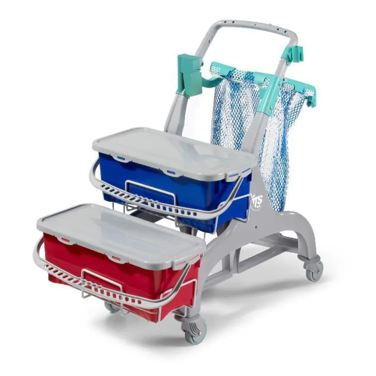 Voziček namenjen za uporabo s sistemom prednamakanja oz. predpriprave krp za čiščenje. Z držalom za vreče, ki je namenjeno zbiranju umazanih krp. Idealen za profesionalno čiščenje v okoljih z dvema različnima stopnjama tveganja.