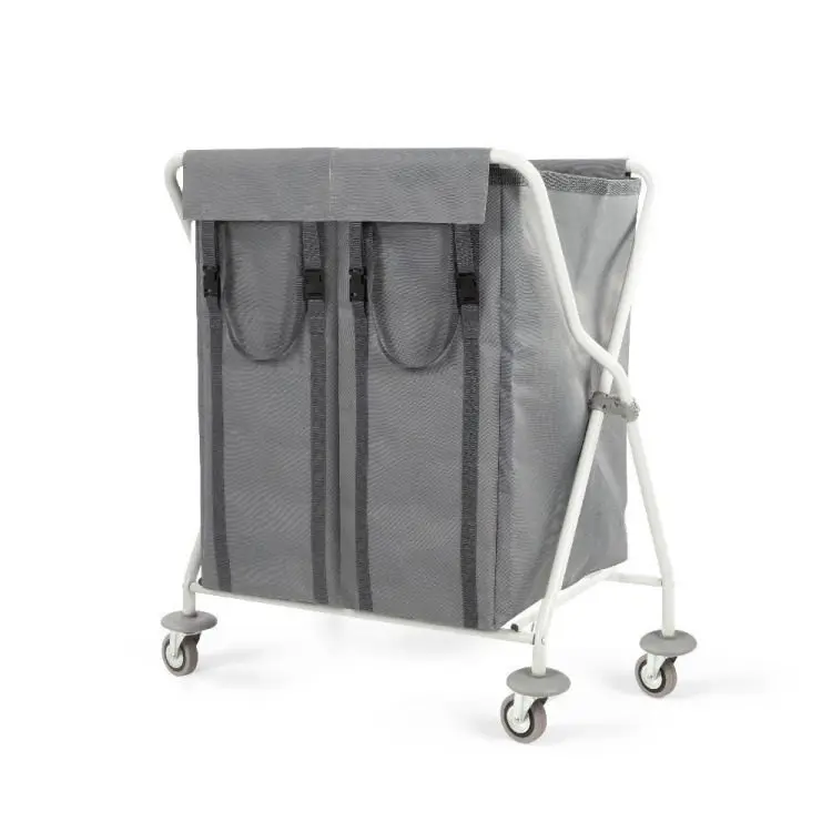 Voziček za perilo z držalom za vrečke za zbiranje umazanega perila. Idealen za zbiranje umazanega perila v hotelih, penzionih, apartmajih. Zložljiv voziček s kolesi ø 80 mm in odbijači, z dvema 100 L torbama z zadrgo.