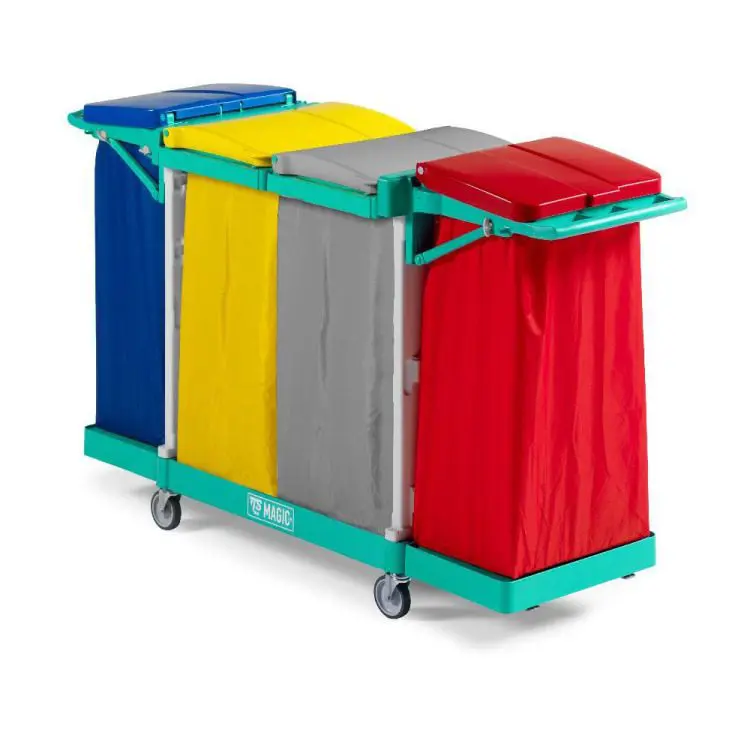 Voziček za smeti, za ločeno zbiranje odpadkov z zložljivim zdržalom vreč. Idealen za praznjenje košev za smeti v okoljih z malo prostora. S pokrovi košev v različnih barvah.