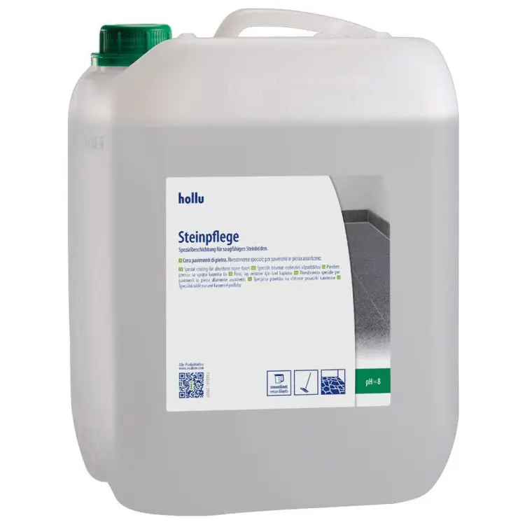 Visoko sijoči zaščitni premaz za naravni in umetni kamen (npr. marmor, terazzo, cotto itd.). Idealen za premazovanje kamnitih površin na hodnikih in vhodih. Emulzija na osnovi visoko kakovostnih polimerov. Zaščitni premaz za tla Hollu Steinpflege je izredno trpežen, sijoč, ima zelo visoko vodoodpornost ter ohranja naravne lastnosti in videz tal. Je zelo obstojnen, ustvari varovalen film, ni občutljiv na umazanijo, rise, sledi hoje,…